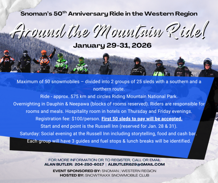 The ride will be circling the perimeter of Riding Mountain National Park. It is open to the first 50 sleds to pay registration fee of $100. The ride will be approximately 575 kms in length spanning January 29 - 31 (riders responsible for rooms and meals). The riders will be split into 2 groups leaving from Russell Inn. One group of 25 will go clockwise and the other will go counter-clockwise. There will be blocks of rooms in Russell for January 28 & 31, 2026, and in Neepawa and Dauphin for January 29 & 30, 2026.